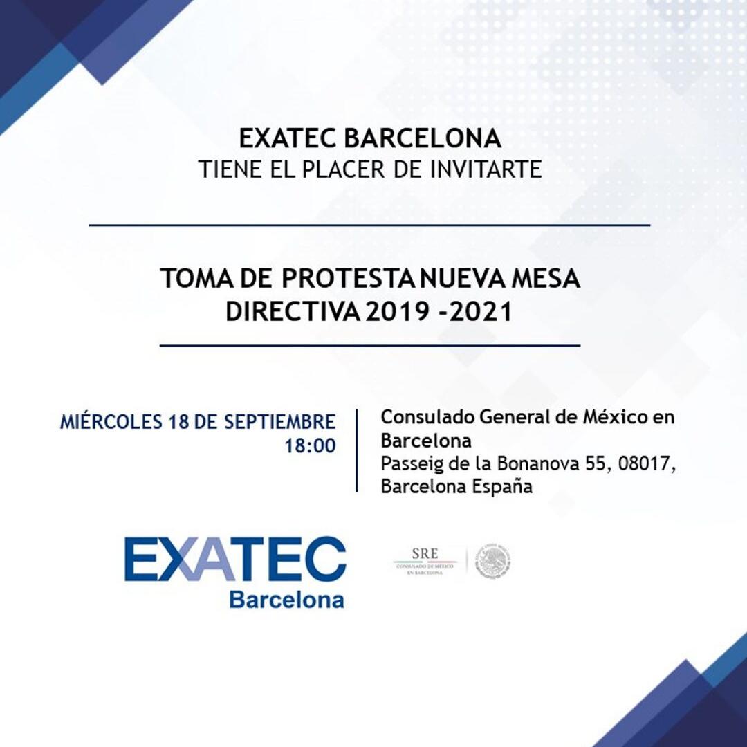 EXATEC Barcelona tiene el placer de invitarte a la Toma de protesta de la nueva mesa directiva para el periodo 2019-2020. La cita es el próximo miércoles 18 de Septiembre a las 18:00 hrs. en el Consulado General de México en Barcelona, el cual se encuentra ubicado en Passeig de la Bonanova 55, 08017, en